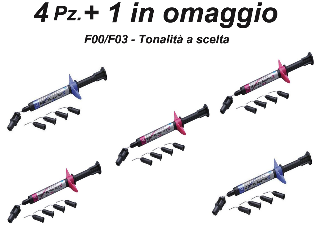 Beautifil Flow PlusX - QUATTRO Siringhe a SCELTA + 1 in OMAGGIO da 2,2g. + 15 puntali - Viscosità F00/F03 P.S. Con questa scelta gentilmente comunicateci le tonalità e viscosità desiderate nelle note dell'ordine.