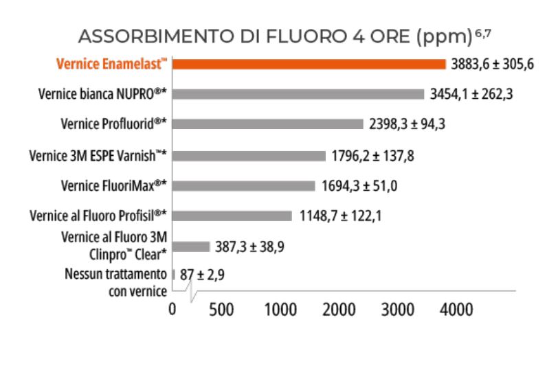 L'assorbimento superiore della vernice al fluoro di Enamelast è il risultato della sua formula brevettata che promuove l'adesione, che assicura che la vernice rimanga sui denti più a lungo. Invece di sfaldarsi i denti in pezzi, si dissolve lentamente per un lungo periodo di tempo consentendo un maggiore assorbimento del fluoro.