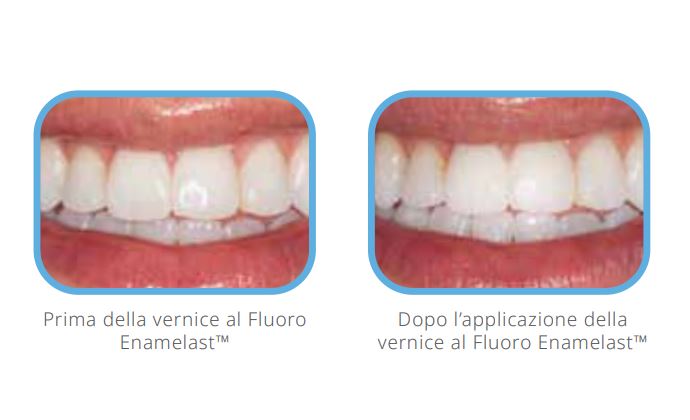 La vernice al fluoro Enamelast ™ è un fluoruro di sodio al 5% aromatizzato e addolcito con xilitolo in un veicolo di resina che produce un'occlusione meccanica / chimica dei tubuli dentinali nel trattamento dell'ipersensibilità dentale. La sua formula brevettata che promuove l'adesione migliora la ritenzione, fornendo un rilascio e un assorbimento superiori del fluoro. Non è grintoso, quasi invisibile in apparenza ed è disponibile in cinque gusti dal gusto eccezionale e due opzioni di consegna. La vernice Enamelast non contiene frutta a guscio e glutine.