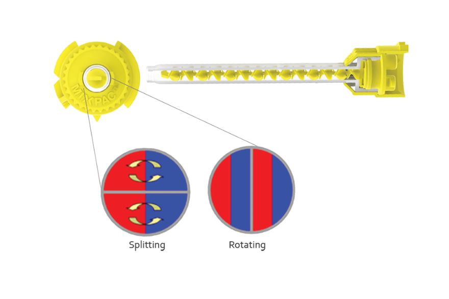 La geometria di miscelazione intelligente del miscelatore MIXPAC T-Mixer distribuisce uniformemente le singole catene polimeriche per ottenere un'efficiente reazione di reticolazione tra i materiali bicomponenti, con conseguente miglioramento della qualità della miscelazione, che risulta omogenea e priva di vuoti.